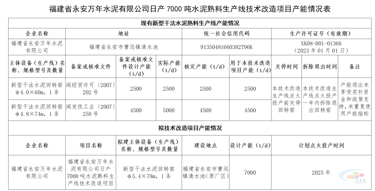 公示顯示,福建省永安萬年水泥有限公司擬拆除整合公司現有的1條日產2500噸和1條日產4500噸水泥熟料生產線,在原廠區技術改造建設1條日產7000噸水泥熟料生產線。生產線計劃點火投產時間為2025年。